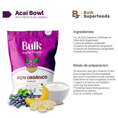 Añade una cucharada de Acai en Polvo Orgánico a tu batido, smoothie, yogurt, avena o postres saludables. También puedes mezclarlo con agua o jugo para una bebida nutritiva.