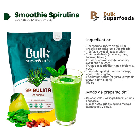 Añade una cucharadita de Espirulina en Polvo a tus batidos, jugos, sopas o cualquier receta para aumentar su valor nutricional. También puedes mezclarla con agua o jugo para una bebida saludable.